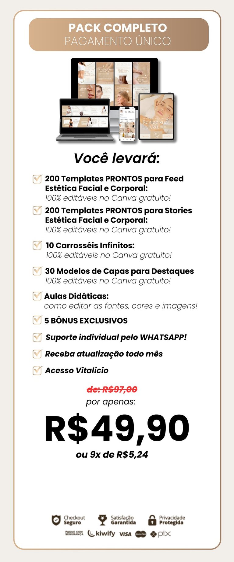 Perfeito para clínicas e profissionais da estética que desejam apresentar seus serviços com mais organização, beleza e credibilidade.